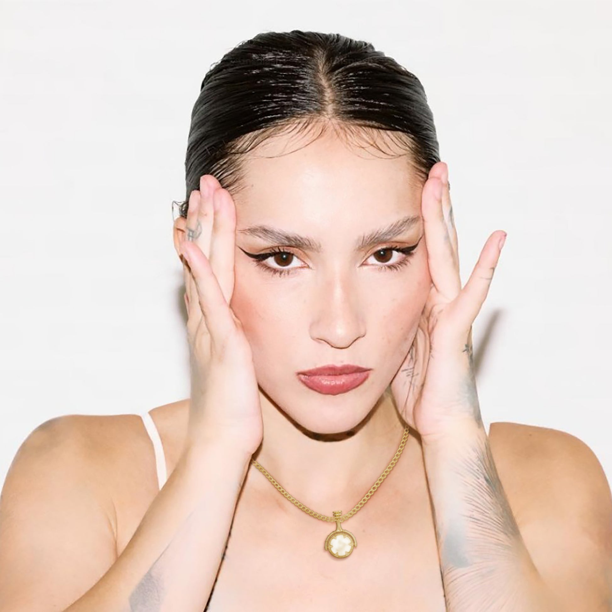 18K gold vermeil medallion necklace featuring a luminous mother of pearl inlay, blending softness and strength in a timeless silhouette
