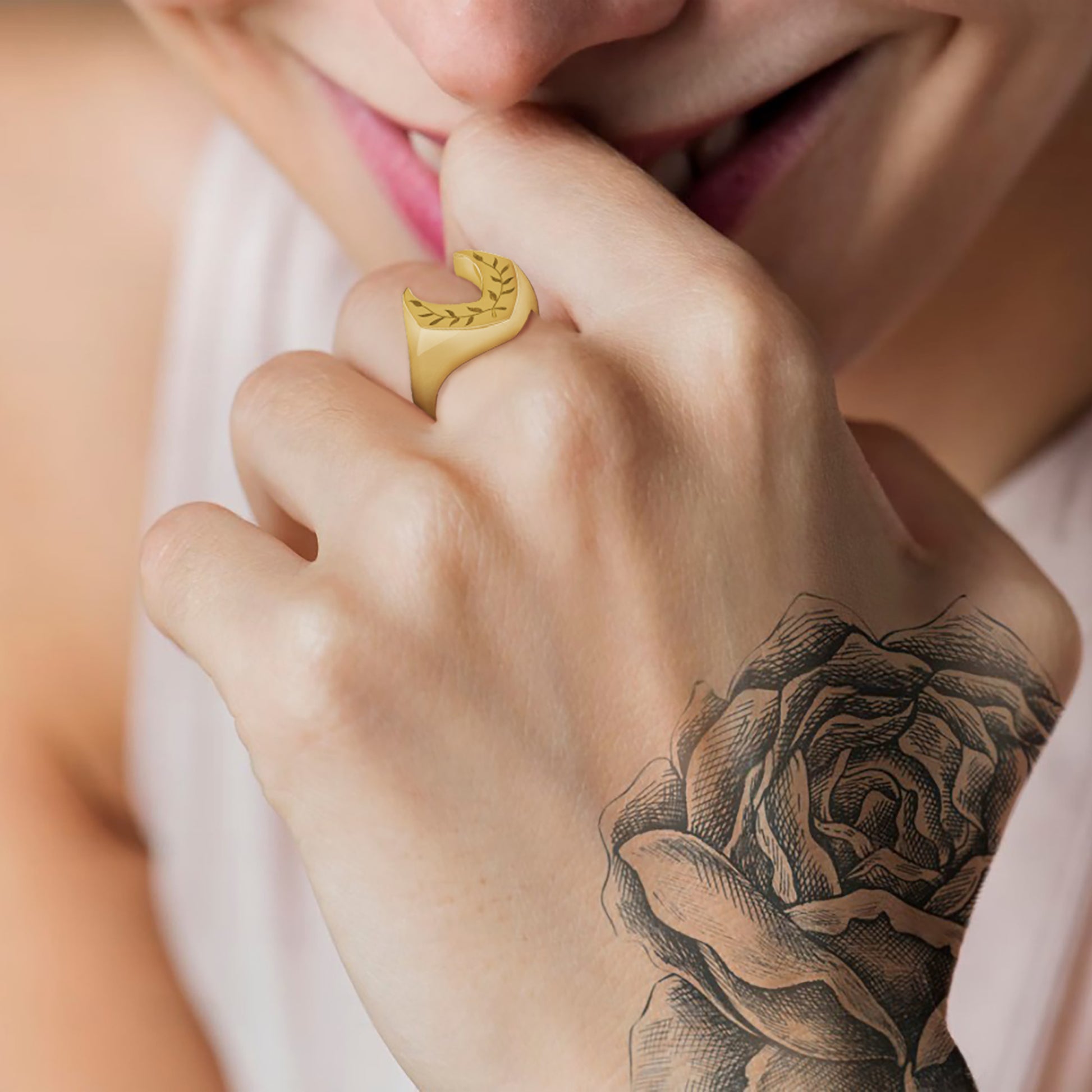 Bold 18K gold vermeil signet ring adorned with an engraved laurel wreath, symbolizing strength and victory with refined simplicity