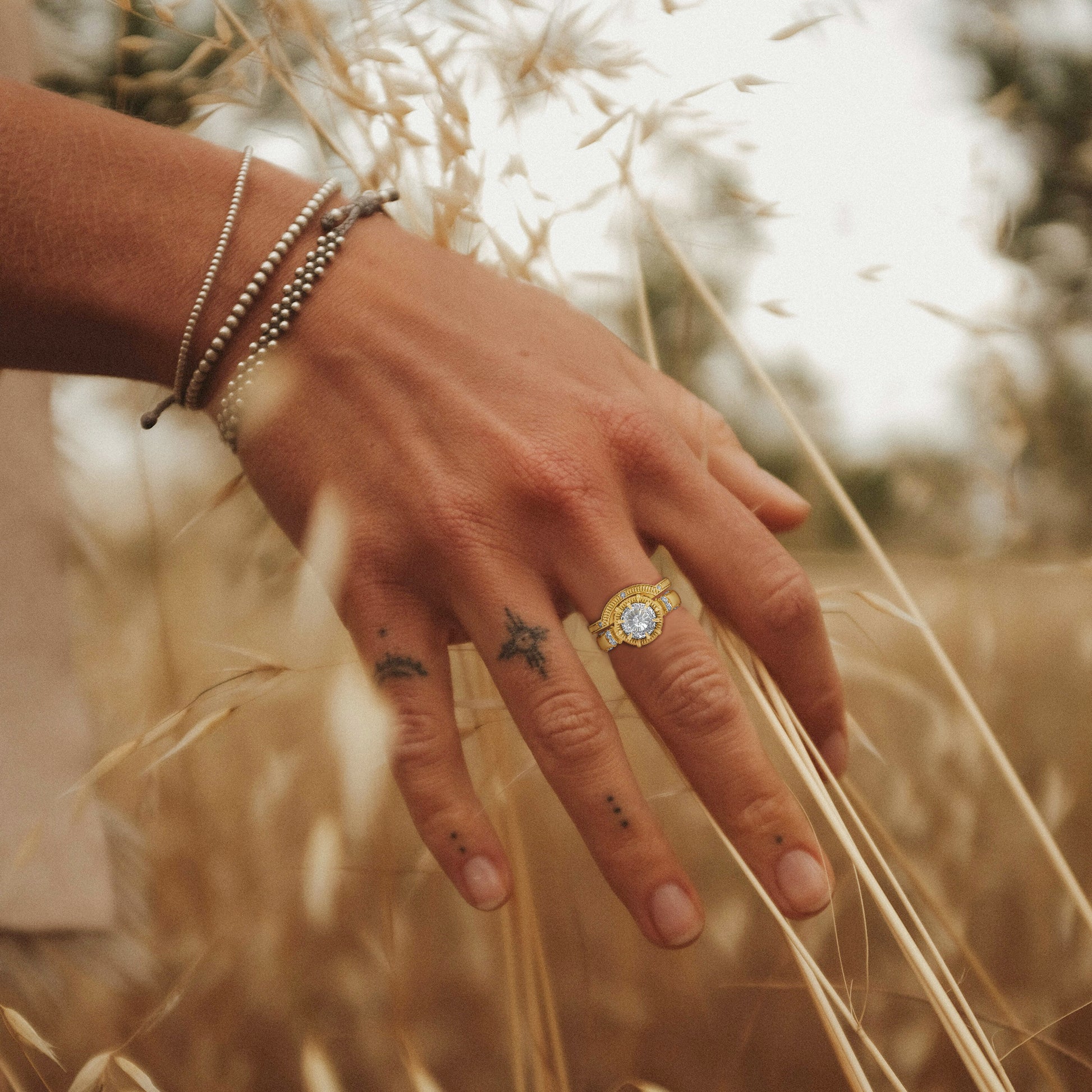 Ornate 18K gold vermeil ring set with a brilliant VS-quality lab diamond and intricate sculpted detailing, paired with a matching contour band for a bold yet romantic statement